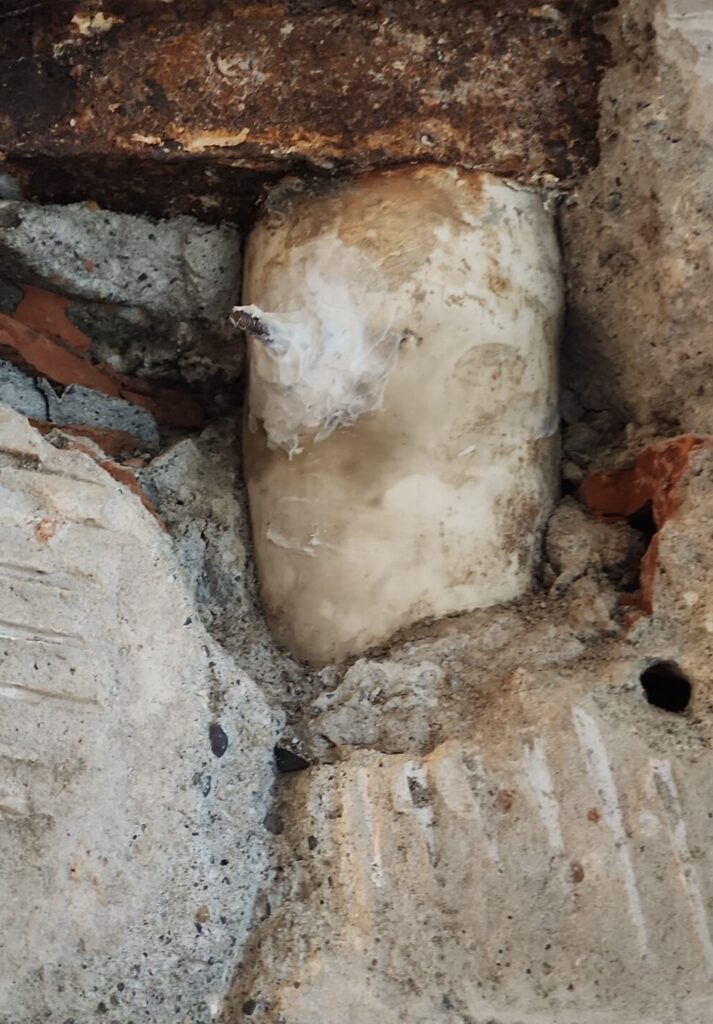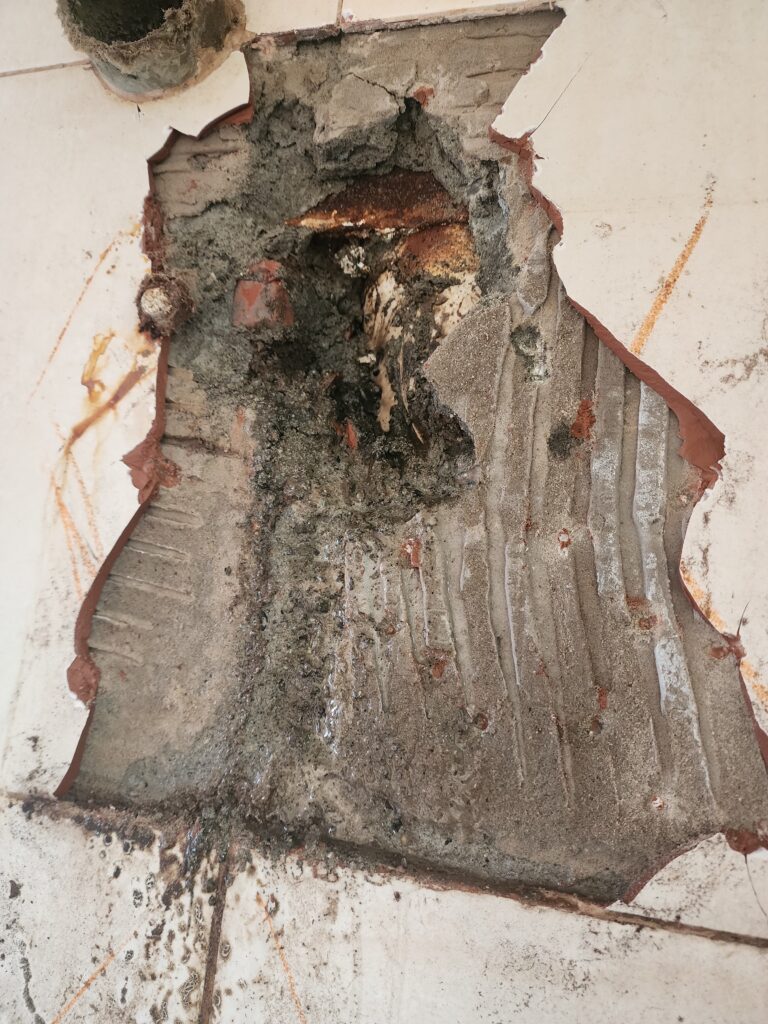 El momento en el que rompimos los hermosos azulejos, que no sabía si iba a poder volver a conseguir, encontramos un desastre, en algún momento se había perforado un caño de desagote que venia de los pisos de arriba y se le había hecho un parche muy precario que obviamente no duro demasiado. Obviamente tampoco quería tener que romper la pared, y claramente encontrarme con el desastre, pero no era algo que podia evitar si quería saber realmente como solucionar el problema de una vez por todas.